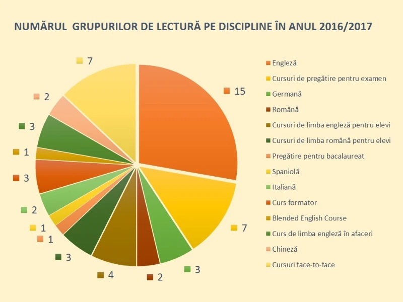 În acest an academic am avut 20 de grupe de limbă engleză, 3 grupe de limba germană, 2 grupe de limba română, 2 grupe de limba chineză, 2 grupe de limba italiană şi o grupă de limba spaniolă. Pe lîngă acestea au mai învățat cu noi 6 grupe de copii (sub 15 ani), care au studiat limba engleză şi limba română.